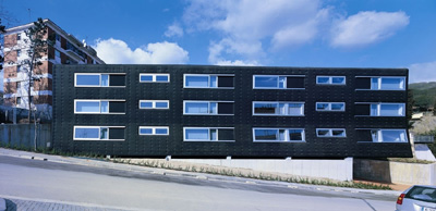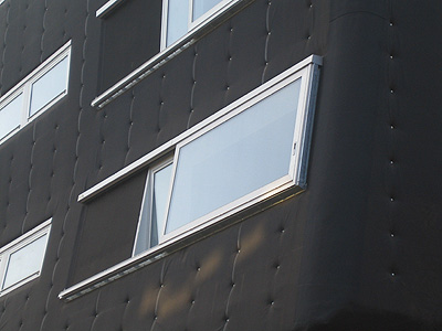 El innovador edificio de Arturo Frediani ha incorporado en su fachada una carpintería de aluminio muy singular. Lo primero que llama la atención es el contraste entre el color negro de la fachada y el color anodizado plata mate de los perfiles de aluminio, dándole a la fachada un aspecto muy moderno. Las ventanas están enrasadas con el exterior de la fachada, aspecto este muy diferenciado de lo que es la instalación de la carpintería exterior en nuestro país. Los ventanales principales se componen de una ventana practicable junto a una ventana corredera-elevable que se desliza por delante de la fachada ¡Ventanas correderas elevables en VPO! Parece que las cosas están cambiando en España. Un detalle muy atractivo que además técnicamente supuso un reto importante, es la línea de ventanas inferior, ya que están inclinadas 8° respecto la vertical, y eso sin influir su funcionamiento. El resultado como puede verse es sin duda singular e insólito. El edificio tendrá amantes y detractores, pero seguro que a nadie deja indiferente.