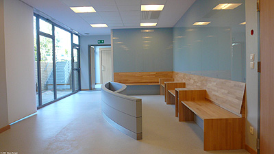 Hospital Saint-Pierre en Ottignies (Bélgica) y la clínica Saint-Georges en Niza (Francia) El hospital Saint-Pierre Ottignies (Bélgica) se está equipando con vidrio Lacobel AB de color azul pastel en las zonas de paso (salas de espera y consultorios, pasillos, etc.). Equipado con un film de seguridad, el vidrio se está instalando como revestimiento mural, en especial junto a fregaderos y lavabos. En la clínica Saint-Georges en Niza (Francia) han escogido el mismo color azul pastel para las paredes de un quirófano especialmente dedicado a la cirugía de la mano.