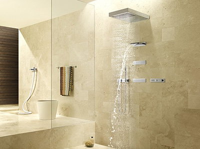 El primer acto de Energizing: Calentar Dos duchas laterales WaterBar inician el escenario con una lluvia pulverizada suave. La temperatura y el caudal de agua aumentan lentamente. El pulso se relaja. La lluvia de la ducha de cabeza JustRain empieza a caer y comienza también a calentarse grado a grado. La piel y los músculos se calientan, los vasos sanguíneos se expanden. El WaterBar superior se detiene, poco después el inferior también. El cuerpo está preparado para el siguiente acto.