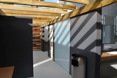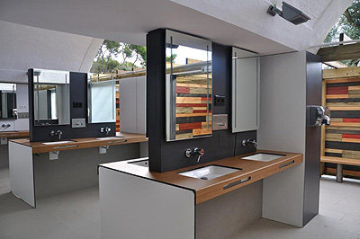Se han instalado todas las cabinas de aseo y ducha con el mismo Sistema I-25 que tan buen resultado ha dado durante muchos años en estas mismas instalaciones. Únicamente se ha variado el diseño de la placa de resinas fenólicas (HPL) de divisiones, escogiendo el mismo color blanco pero con un rayado vertical. Asimismo, se han instalado cabinas con diseño especial para cambia bebés, minusválidos, limpieza y wc químico. Todas las cabinas se han equipado con perchas inox y estante postformados. Además, se han fabricado todos los frentes de registro para instalaciones de agua y electricidad, ya que algunas se encuentran ubicadas en el exterior, evitándose así cualquier tarea de mantenimiento.