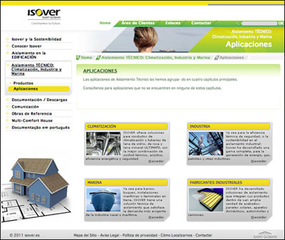 Isover segmentada en dos grupos (Aislamiento en la Edificación y Aislamiento Técnico), donde: existe la posibilidad de filtrado por categorías; sus contenidos están disponibles para ser mostrados a través del buscador de la página; la relación entre los diferentes objetos (fichas técnicas, catálogos, certificados, documentación complementaria, etc.) permite ofrecer al usuario una información muy completa.