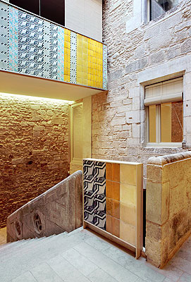 En otros casos se optó por cambiar su localización original para convertirlas en jardines inertes, panoramas cromáticos de los espacios colectivos de la casa: en el patio de la escalera gótica hidráulicos y cerámicas configuran la cara exterior de terrazas y rellanos. El brillo de las piezas vidriadas, estratégicamente situadas para recibir la incidencia directa del sol, reverbera por todo el vacío transformando su luz a lo largo del día.