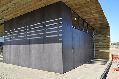 La dirección facultativa ha escogido el panel de color negro tanto para el exterior como en el interior. El exterior se ha barnizado en todas sus caras con un barniz incoloro de resina acrílica. Al encontrarse el edifico a muy poca distancia del mar, todo el revestimiento se ha instalado sobre estructura de acero galvanizado para garantizar una mayor resistencia a la intemperie.
