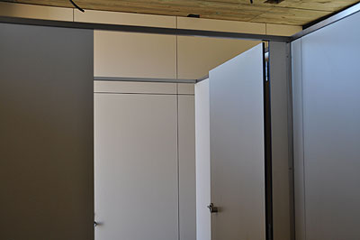 En la zona de aseos, el revestimiento escogido ha sido el de placas de resinas fenólicas o laminado de alta presión (H.P.L.), tan utilizados en otras muchas ocasiones con un resultado de dureza y durabilidad extraordinarios. El color escogido ha sido un beige-crema para el revestimiento perimetral así como para las mamparas de separación entre aseos del sistema I-25. Todos los herrajes de estas mamparas son de acero inoxidable aisi 304 y 316 con placa H.P.L de 13 mm de espesor. La placa para el revestimiento en este caso es de 8 mm de espesor.