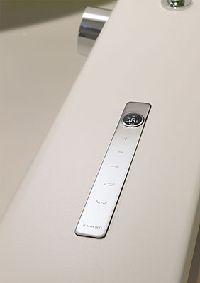 Kaldewei , con unidad de control electrónica, se puede integrar casi a ras del borde de la bañera, permitiendo seleccionar la temperatura que se desea antes de la entrada de agua. Ya sea a la temperatura preajustada de 38,5°C, más caliente o más fría: el agua llena la bañera desde el primer segundo de forma uniforme a la temperatura seleccionada que, evidentemente, se puede modificar durante la entrada de agua cómodamente con pulsaciones del dedo de forma individualizada en pasos de 0,5°C. Por motivos de seguridad, en principio es posible una temperatura máxima de 43°C, que mediante una combinación de teclas especiales se pueden aumentar hasta los 50°C.