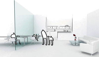 "Entendemos que uno de los beneficios que te puede dar el trabajo en casa cuando tienes una familia es disfrutar de su compañía sin perder la posibilidad de aislarte cuando sea necesario. Nuestro proyecto responde a esa situación y necesidades. Partimos de la utilización de las superficies interactivas como medio de trabajo y ocio. Una pared móvil de vidrio transparente que se vuelve opaco según la necesidad y sobre el cual se puede proyectar. Es una superficie vertical que se utilizará para trabajar, jugar, en una o ambas caras simultáneamente. Este tabique contiene dos mesas que se deslizan juntas o por separado a ambos lados de la superficie de vidrio creando distintas combinaciones según las necesidades de la actividad a desarrollar" , explican los jóvenes diseñadores que han participado en este proyecto.