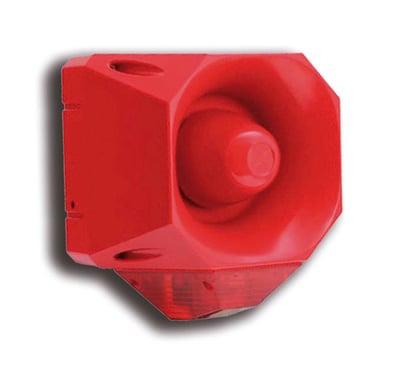 Sirena de elevada potencia acústica con foco para uso industrial de Aguilera Electrónica. Certificada según EN 54-3. Protección: IP66. Nivel sonoro: 120dB a 24Vcc