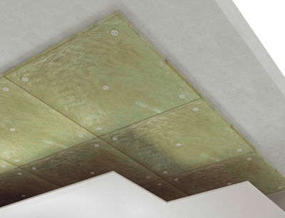 Colocación del aislante Ursa Terra de Ursa fijado mecánicamente bajo el forjado de garajes o locales comerciales garantizando un buen nivel de aislamiento térmico y acústico de la vivienda sobre este espacio, compuesto por plenum; aislamiento térmico mediante panel de de lana mineral semirrígido, URSA TERRA Plus 32 T0003 de URSA. 80x400x5400 mm. 2.5 m²·K/W. No hidrófilo, de altas prestaciones mecánicas, sin recubrimiento; acabado con placa de yeso perforada.
