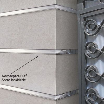 Perfil de separación para la unión, nivelación y soporte de piezas cerámicas en fachadas Novosepara Fix® de Emac® fabricado en aluminio anodizado acabado plata mate nº13. Perfil de longitud 2,5 m., con ala de fijación con colisos especiales para anclajes mecánicos, cara vista a:11 mm., recubierto con film protector y destinado a complementar baldosas u otros revestimientos de espesor total 12 mm., colocado según se indica en la ficha técnica del fabricante.