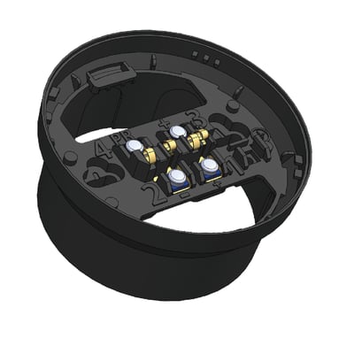 Base de conexión de perfil alto con 4 entrada de tubo visto para la gama de detectores convencionales y analógicos de la serie 100. Contactos inoxidables. Color Negra. Dimensiones: 104 x 49 mm.