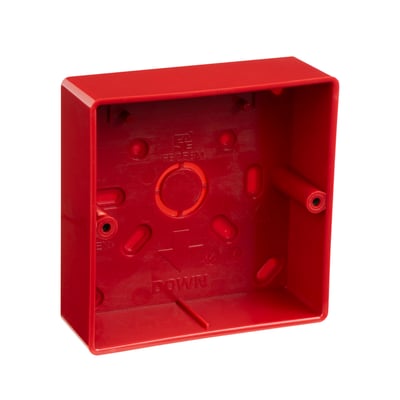 Base de superficie y espacio para entrada de tubo visto para pulsadores de la serie DMCL05 y PAE-550AX. Dimensiones 98 x 98 x 33 mm.