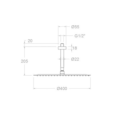 Brazo cenital de 150 mm con rociador Ultraslim metálico Ø 400 mm antical, referencia BVRM400 de Ramón Soler. Acero inox AISI304
