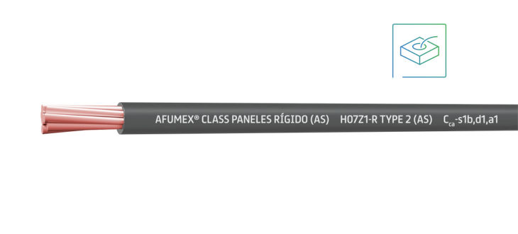 Cable Afumex Class Paneles Rígido (AS) de Prysmian con aislamiento termoestable (90 ºC). Tipo ES07Z-R (AS) con conductor de cobre rígido, tensión asignada 450/750 V y de alta seguridad (AS). Aislamiento Afumex termoestable. Clase de reacción al fuego Cca-s1b,d1,a1. Libre de halógenos, no propagador de la llama ni del incendio, baja emisión de humos, reducida emisión de calor, bajo desprendimiento de gotas/partículas incandescentes, baja emisión de gases tóxicos y nula emisión de gases corrosivos. Diseñado según UNE-EN 21027-9.