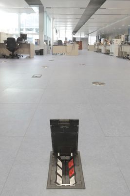 Perforación de medida determinada en baldosa para posicionamiento de caja eléctrica y posterior forrado de tapa con revestimiento fexible sobre baldosas de suelo técnico elevado POLYGROUP GAMAFLOR.