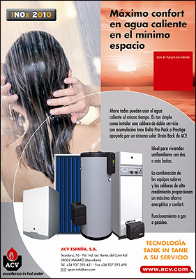 ACV ha puesto en marcha su campaña INOX 2010 ofreciendo a instaladores sus equipos domésticos de Vanguardia especiales para viviendas unifamiliares, calderas de condensación con la máxima eficiencia energética (4 estrellas energéticas), equipos Drain Back Inox y calderas Propack a gas o gasóleo, presurizada o estanca, con prestaciones en agua caliente sanitaria superiores a sus rivales de otras marcas incluso con potencias superiores.
