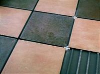 Las crucetas se intercalan en todas las esquinas de las baldosas y se ajustan de modo que queden incrustadas en el material de agarre, cubriéndolas, finalmente, con el relleno de juntas (por cada baldosa una cruceta).