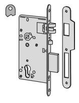 Cerradura C.Madera CISA 60mm HEAVY DUTY con picaporte y palanca, antipánico, cuadradillo pasante, frente latonado. Sin cilindro. Frente redondo.