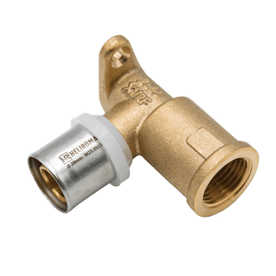 Codo hembra con placa largo, referencia K2102016-LN de la serie klimapress de Heliroma. Medida: 16x1/2”. Latón