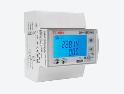 Contador de energía trifásico directo con certificado MID, CEM-D211 -MID de Circutor Alimentación en alterna Tensión nominal 3 x 127/220 ... 3 x 230/400 V ~ ± 20 % Frecuencia 50 … 60 Hz Consumo < 0.5 W, < 2 VA Categoría de la instalación CAT III 300 V Circuito de medida de tensión Tensión nominal 3 x 127/220 ... 3 x 230/400 V ~ ± 20 % Circuito de medida de corriente Corriente mínima de medida 0.250 A Corriente de referencia (Iref) 5 A Corriente de transición 0.500 A Consumo < 1 VA Precisión de medidas Medida de energía activa (kWh) Clase B (UNE-EN-50470) Medida de energía reactiva (kvarh) Clase 2 (IEC 62053-23) Salidas digitales de transistor Tipo Optoacoplador Tensión máxima ≤ 27 V Corriente máxima ≤ 27 mA Duración pulso (Ton/Toff) Ton: 40 ms / Toff: 64.34 ms Interface usuario Tipo display LCD Máximo valor 4294967 kWh LED 2 LED: kWh: 4000 imp/kWh, kvarh: 4000 imp/kvarh Teclado 2 teclas Características ambientales Temperatura de trabajo -40 ... +70 ºC Temperatura de almacenamiento -40 .. +85 ºC Humedad relativa (sin condensación) 5 … 95 % Grado de protección IP 51 (instalado) IP 40 (zona bornes) Características mecánicas Envolvente PC+ABS Fijación carril DIN (IEC 60715) Peso Neto (kg) 0,38 Tamaño (mm) ancho x alto x fondo 71.5 x 90 x 74 (mm) Normas Normas IEC-62053-21; IEC 62053-23; IEC 62053-52; IEC 62052-11; UNE-EN 50470-3; MID (EU Directive 2014/32/EU on Measuring Instruments Annex II, Module B