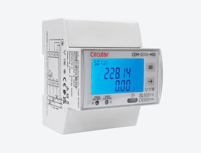 Contador de energía trifásico indirecto con certificado MID, CEM-D312 -MID de Circutor Alimentación en alterna Tensión nominal 3 x 127/220 ... 3 x 230/400 V ~ ± 20 % Frecuencia 50 … 60 Hz Consumo < 0.5 W, < 2 VA Categoría de la instalación CAT III 300 V Circuito de medida de tensión Tensión nominal 3 x 127/220 ... 3 x 230/400 V ~ ± 20 % Circuito de medida de corriente Corriente mínima de medida …/5 A (0.05A) Corriente de referencia (Iref) …/5 A (5A) Corriente de transición 0.250 A Consumo < 1 VA Precisión de medidas Medida de energía activa (kWh) Clase B (UNE-EN-50470) Medida de energía reactiva (kvarh) Clase 2 (IEC 62053-23) Salidas digitales de transistor Tipo Optoacoplador Tensión máxima ≤ 27 V Corriente máxima ≤ 27 mA Duración pulso (Ton/Toff) Ton: 40 ms / Toff: 64.34 ms Interface usuario Tipo display LCD Máximo valor 4294967 kWh LED 2 LED: kWh: 4000 imp/kWh, kvarh: 4000 imp/kvarh Teclado 2 teclas Características ambientales Temperatura de trabajo -40 ... +70 ºC Temperatura de almacenamiento -40 .. +85 ºC Humedad relativa (sin condensación) 5 … 95 % Grado de protección IP 51 (instalado) IP 40 (zona bornes) Características mecánicas Envolvente PC+ABS Fijación carril DIN (IEC 60715) Peso Neto (kg) 0,38 Tamaño (mm) ancho x alto x fondo 71.5 x 90 x 74 (mm) Normas Normas IEC-62053-21; IEC 62053-23; IEC 62053-52; IEC 62052-11; UNE-EN 50470-3; MID (EU Directive 2014/32/EU on Measuring Instruments Annex II, Module B