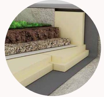 Cubierta invertida ajardinada, con capa drenante; fieltro de separación; aislamiento térmico formado por poliestireno extruido Ursa XPS N-III L de URSA. 70x600x1250 mm. 2 m²·K/W. De superficie lisa y mecanizado lateral a media madera; membrana impermeabilizante y mortero ligero para formación de pendiente.