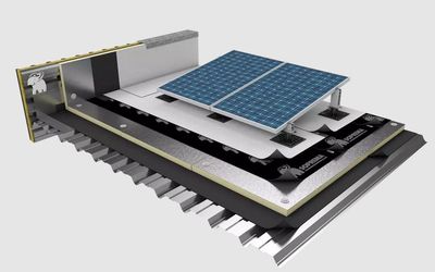 Cubierta constituida por soporte de chapa grecada, barrera de vapor formada por lámina autoadhesiva adherida de betún modificado elastomérico de 2 mm de espesor con armadura de no tejido de fieltro de poliéster reforzado y estabilizado (FP), acabado superior con un film de polipropileno y en la capa inferior acabado en un film siliconado fácilmente extraíble con una flexibilidad a bajas temperaturas < -15ºC tipo EDILSTICK 2 mm PP/RAND (LBA-20-FP según UNE 104410:2013); capa de aislamiento térmico en planchas rígidas de poliisocianurato (P.I.R) recubiertas ambas caras con film de aluminio gofrado de 50 micras, una absorción de agua < 2% y nula difusión de vapor de agua, con un coeficiente de conductividad 0,023 W/m·K, resistencia al fuego Euroclase B-s2-d0, de 80mm de espesor tipo EFIGREEN ACIER 80, instalado mediante fijaciones mecánicas; y membrana impermeabilizante monocapa fijada mecánicamente a la chapa soporte con lámina de betún elastomérico SBS de muy altas prestaciones, con acabado mineral blanco reflectante y descontaminante en la cara superior con tratamiento a base de dióxido de titanio (TiO2) y un film termofusible en la inferior con armadura de fieltro de poliéster reforzado y estabilizado con una flexibilidad a bajas temperaturas < -25ºC tipo SOPRALENE ELITE FM 5 kg D-TOX (LBM-50/G-FP según UNE 104410:2013) con garantía de 15 años. Instalación de soportes de poliamida ajustables en altura (de 120 a 160 mm) tipo SOPRASOLAR FIX EVO TILT BITUMEN para módulos fotovoltaicos de estructura estándar, adheridos a fuego sobre la membrana impermeabilizante SOPRALENE sin necesidad de fijaciones mecánicas que perforen la impermeabilización y un peso de 1,2 kg/ud incluidos SOPRASOLAR ELEVADOR SUPERIOR y SOPRASOLAR ELEVADOR INFERIOR creando una inclinación del módulo de 10º, abrazaderas intermedias y finales para la sujeción de los módulos solares y dispositivo de bloqueo de los elevadores; Listo para recibir la instalación de los módulos fotovoltaicos. Instalación de losetas flexibles de caucho reciclado de 50x50cm ranuradas por la cara inferior que permite el paso del agua tipo SOPRACOVER DALLE de Soprema para la realización de pasarelas en cubiertas técnicas y trabajos de mantenimiento protegiendo la membrana impermeabilizante. Incluido UD. de desagüe compuesta por cazoleta prefabricada con refuerzo de membrana de betún SEBS y tubo rígido clipado de PEAD tipo DRAINI VERTICAL BTM, incluido MORRIÓN UNIVERSAL SOPREMA totalmente adherida sobre la primera capa de lámina bituminosa, lista para recibir la segunda capa completamente adherida a fuego sobre la cazoleta. ML. de impermeabilización de juntas de dilatación, mediante bandas de adherencia de 33 cm de ancho tipo MORTERPLAS SBS FP 3 kg BAND 33 a cada lado de la junta previa imprimación con SOPRADÈRE (250 g/m2); banda de 50 cm de ancho, adherida a ambos lados de la misma formando fuelle tipo SOPRALENE ELITE FP 4 KG y con solapes transversales de al menos 15 cm; fondo de junta de diámetro 25 mm tipo JOINFAL y tapajuntas mediante banda autoprotegida de 33 cm tipo SOPRALENE ELITE FP 4 KG MIN, listo para recibir el sistema de la parte general de la cubierta. Productos con marcado CE europeo y sistema de impermeabilización de cubiertas con membrana fijadas mecánicamente en Cubiertas Deck ETA Nº 06/0018 y UNE 104401. Sistema completo SOPREMA con 15 años de garantía de impermeabilización.