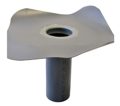 Desagüe rígido con babero RENOLIT RENOLIT ALKORPLAN 81088-082 Pieza preformada de tubo de pvc-p con un diámetro de 75 mm y con una longitud de 250 mm hasta 600 mm en color gris o negro con base rígida horizontal al que ira termosoldado un babero de pieza cuadrada de lámina RENOLIT RENOLIT ALKORPLAN F de 1,5 mm de espesor en color gris claro para facilitar la impermeabilización de los bajantes de agua.