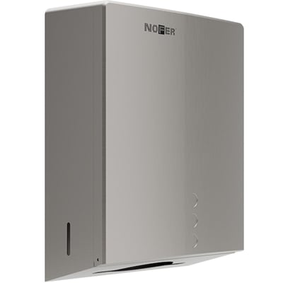 Dispensador de papel toalla NOFER de acero inoxidable AISI 304, acabado satinado, de apertura frontal para adosar a pared. Adecuado para toallas plegadas o engarzadas (zig-zag), con visores de contenido y llave de seguridad. Dimensiones: 300 alto x 255 ancho x 105 fondo (mm).