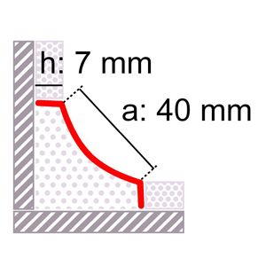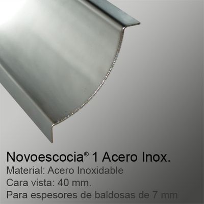 Perfil en forma de media caña cóncava para evitar ángulos rectos internos Novoescocia® 1 de Emac®. Fabricada en acero inoxidable AISI 304 acabado alto brillo Nº 16. Perfil de 2,50 m. de longitud, con caravista a: 40 mm y destinado a complementar baldosas u otro tipo de revestimientos con un espesor total desde 7 mm, para su instalación durante el embaldosado, colocado según se indica en la ficha técnica del fabricante y con la posibilidad de complementar con las piezas de ángulo para evitar el inglete.