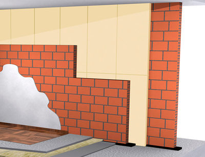 Fachada de doble hoja de fábrica con aislamiento térmico intermedio URSA XPS N-W E de URSA, compuesta por hoja exterior de ladrillo hueco doble; aislamiento térmico mediante panel de poliestireno extruido, URSA XPS N-W E de URSA. 100x600x2600 mm. 2.85 m²·K/W. De superficie lisa y mecanizado lateral machihembrado; hoja interior de 1/2 pie de ladrillo hueco doble y acabado interior de enlucido de yeso.