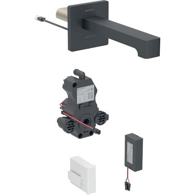 Grifo electrónico para lavabos Geberit Brenta, montaje mural, servicio a batería, para caja funcional empotrada: Negro mate / Con revestimiento de limpieza fácil, L=22cm, Mezclador=Con mezclador