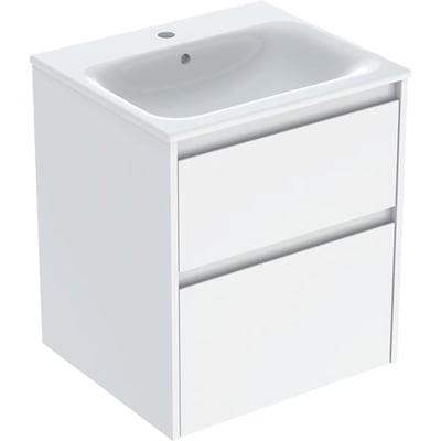 Juego de lavabo para mueble Geberit Selnova Square, borde fino, dos cajones, mueble bajo para lavabo: 55x62.1x48cm, Ancho de lavabo=55cm, Lavabo: blanco, Cuerpo, Frontal: blanco / cubierto con brillo satinado