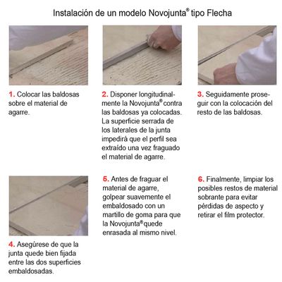 Junta de dilatación prefabricada en forma de flecha para absorber los movimientos de las superficies revestidas Novojunta® Metallic Flecha de Emac®. Compuesta por dos perfiles de aluminio unidos lateralmente a un cuerpo central flexible de caucho EPDM microcelular color gris nº02. Perfil de 2,50 m. de longitud con superficie lateral serrada, protegido por un film protector y una altura total de 50 mm, movimiento admitido +1,2/-3,5 mm., colocado según se indica en la ficha técnica del fabricante.