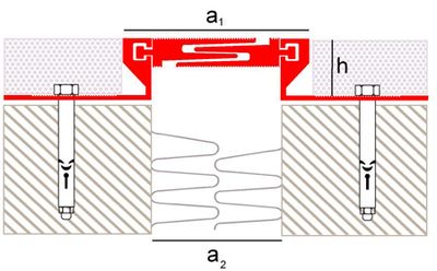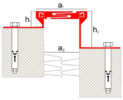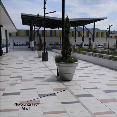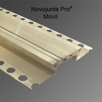 Junta de movimiento prefabricada para cubrir juntas estructurales Novojunta Pro® Móvil de Emac®. Fabricada en aluminio color natural, formada por dos perfiles unidos lateralmente a dos piezas centrales acopladas y articuladas. Perfil de 2,50 m. de longitud montado para la instalación, protegido por un film protector, con alas de fijación troqueladas mediante perforaciones en forma de octógono y separador asegurador de la distancia de acople, con un movimiento admitido de +/- 5 mm., destinado a cubrir anchos de junta estructural de hasta 50 mm. como máximo y a complementar baldosas u otro tipo de revestimientos con un espesor total de 70 mm., colocado según se indica en la ficha técnica del fabricante con posibilidad de complementar con la membrana de estanqueidad de 170 mm.