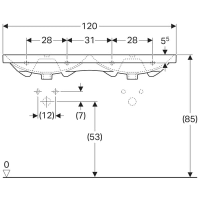 Lavabo de dos senos Geberit Acanto: 120x48cm, Toma de grifo=Sin, Rebosadero=Visible, Blanco