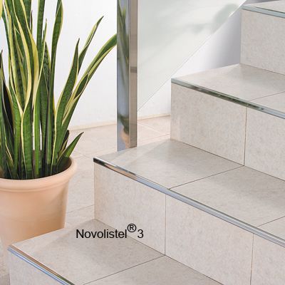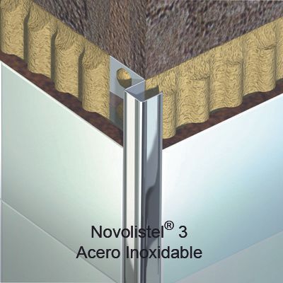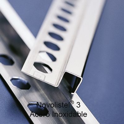 Perfil listel 7 en 1 de caravista cuadrada Novolistel® 3 acero Inoxidable de Emac®. Fabricado en acero Inoxidable AISI 304 acabado Alto Brillo Nº16. SIN PROTECTOR. Perfil de 2,50 m. de longitud, con ala de fijación troquelada mediante perforaciones en forma de octógono y destinado a complementar baldosas u otro tipo de revestimientos con un espesor total de 12 mm, colocado según se indica en la ficha técnica del fabricante.
