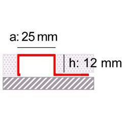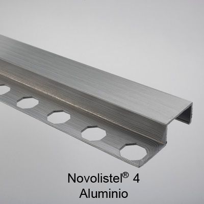 Perfil listel de caravista rectangular Novolistel® 4 aluminio de Emac®. Fabricado en aluminio 6063 anodizado plata mate Nº13. Perfil de 2,50 m. de longitud, con ala de fijación troquelada mediante perforaciones en forma de octógono, con un valor de caravista a: 25 mm. y destinado a complementar baldosas u otro tipo de pavimentos con un espesor total de 12 mm, colocado según se indica en la ficha técnica del fabricante y con posibilidad de complementar con piezas para esquinas y evitar tener que hacer inglete.