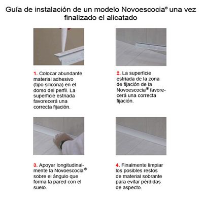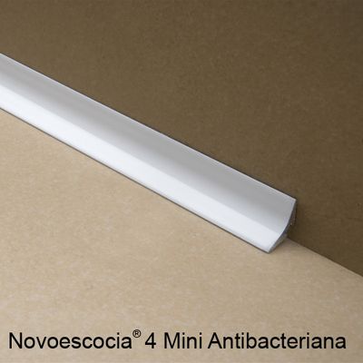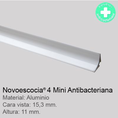 Perfil de reducida caravista en forma de media caña cóncava para evitar ángulos rectos internos Novoescocia® 4 Mini antibacteriana de Emac®. Fabricada en aluminio con acabado blanco brillo antibacteriano. Perfil de 2,50 m. de longitud con superficie de fijación estriada, altura h:11 mm y caravista a: 15,3 mm, para su instalación una vez finalizado el alicatado, colocado según se indica en la ficha técnica del fabricante y con la posibilidad de complementar con las piezas de ángulo para evitar el inglete.