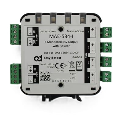 Módulo analógico de control de salida de 24V supervisados, para equipos que requieran alimentación a 24Vcc y señalización óptico-acústicas, discriminando la avería de corte o cortocircuito en dicha línea. Requiere alimentación auxiliar 24Vcc ocupando una dirección por salida en el lazo. Con protocolo de