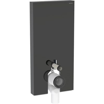 Módulo sanitario Geberit Monolith para inodoro al suelo. Revestimiento frontal: vidrio negro; lateral: aluminio cromado negro