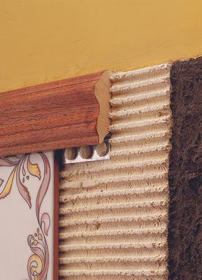 Remate tipo moldura para revestimientos Novomodura de Emac®. Fabricado en madera natural de ayús o similar Nº 56. Perfil de 2,5 m. de longitud, con valor de caravista de 68 mm., colocado según se indica en la ficha técnica del fabricante.