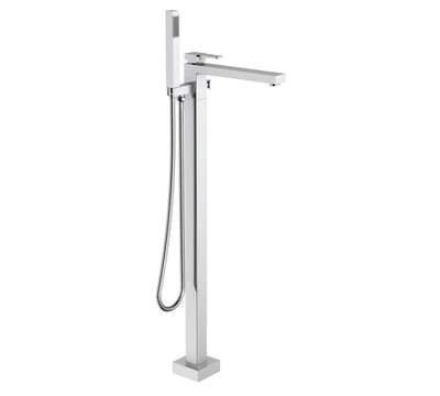 Monomando mezclador de pie para bañera exenta con sistema de regulación para instalar perpendicular y alineado perfectamente con la bañera. Cartucho cerámico D40 convencional. Provisto de un aireador plástico antical con casquillo de latón cromado. Suministrado con conexiones flexibles desde la base hasta el monomando. Incluye todos los elementos de fijación.