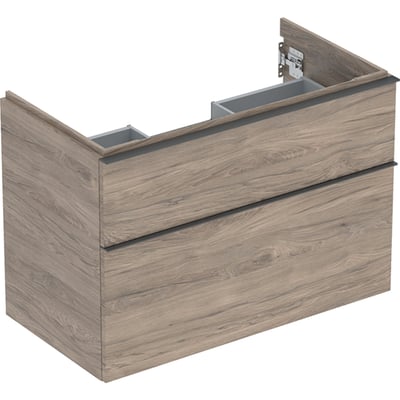 Mueble bajo Geberit serie iCon para lavabo, con dos cajones: Ancho de lavabo=90cm, Cuerpo y frontal: nogal hickory/melamina con textura de madera, Tirador: lava/con pintura polvo al horno mate