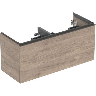 Mueble bajo para lavabo de dos senos Geberit Acanto, con dos cajones y dos cajones interiores: Cuerpo y frontal: nogal hickory/melamina con textura de madera, Tirador: lava/con pintura polvo al horno mate, Ancho de lavabo=120cm