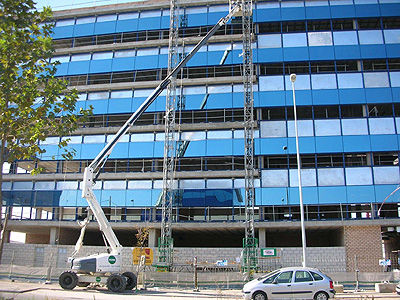Esta máquina dio el relevo a una plataforma articulada de 26 metros de altura y una telescópica de 25 metros, que actualmente están colocando lo que se convertirá en el elemento más llamativo de los edificios: los cristales que cubren las fachadas. Las plataformas se encargan de instalar los soportes exteriores y las vidrieras, un trabajo delicado que requiere de maquinaria precisa y capaz de llegar hasta el punto más alto de las torres.