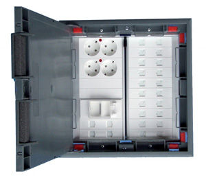 Estas cajas de suelo, con capacidad para tres o cuatro módulos, utilizan todas las placas de la serie TM, incluso se pueden colocar, mediante un marco adaptador, mecanismos estándares de otros fabricantes de 45x45 mm.