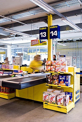 Cefla Arredamenti ha implantado en Makro un modelo específico para puntos de venta cash & carry que facilita el manejo de embalajes grandes y pesados dirigidos a profesionales. Como principal característica, las cajas Futura Max permiten que el carro pase junto al cobrador de caja de manera que éste pueda escanear la mercancía que no se sitúa sobre la cinta por su gran tamaño o peso. Por este motivo, las cajas se han diseñado para que el cobrador pueda trabajar tanto de pie como sentado. Además, el mueble donde se alojan las herramientas informáticas es independiente, lo que facilita el cambio de piezas y actualizaciones, y la inclinación de su cinta facilita el movimiento de los productos con un menor esfuerzo. En definitiva, se trata de un diseño moderno que ayuda al trabajador a conseguir mejores condiciones ergonómicas en su día a día.