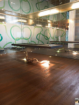 Construmat destaca por la acentuación de las vetas de la madera, un proceso que se realiza escarbando en sus grietas y rellenándolas con resinas naturales de color dorado o plateado. Todo un espectáculo visual.