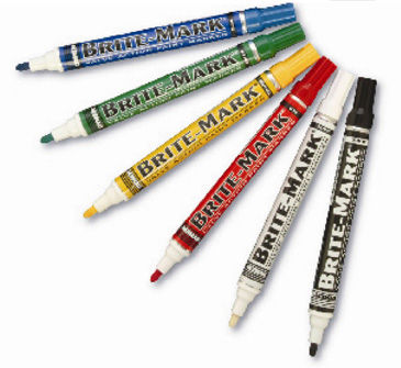 La pintura de los marcadores Brite-Mark se seca en pocos segundos. El puntero del marcador es, asimismo, intercambiable. Disponible en negro, blanco, amarillo, rojo, verde y azul.