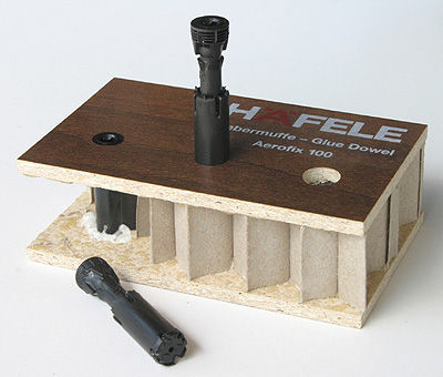 Häfele , y una auténtica novedad, es el manguito adhesivo Aerofix 100. Desarrollado en colaboración con el grupo de empresas Zimmer, permite la preparación racional de los paneles ligeros sin bastidor con recubrimiento de 4 mm para la producción industrial automatizada. Este manguito, además, elimina cualquier dificultad para utilizar técnicas de herrajes convencionales en la construcción de muebles con paneles ligeros.